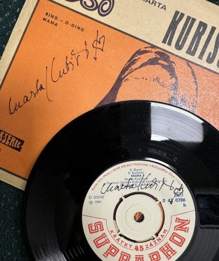 Originální vinylová deska z roku 1969 s obalem, Červánky/Měl snědou tvář, s podpisem Marty Kubišové. Podepsáno dne 17.11.2024 v Kolíně v den výročí 35 let od Sametové revoluce, kde měla Marta Kubišová poslední zastávku Noc s legendou.