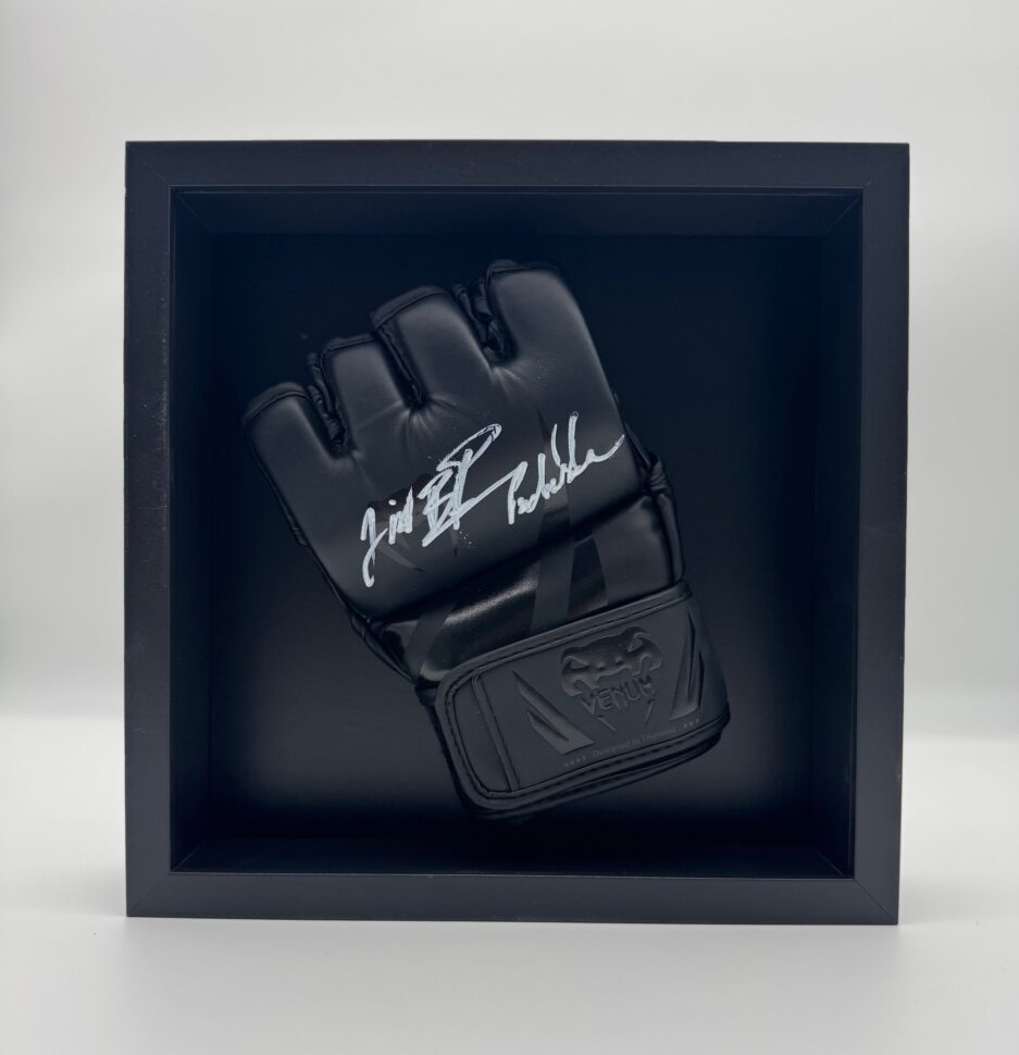 Vlastnoručně podepsaná rukavice MMA zápasníkem Jiřím Denisou Procházkou. Rukavice je vložena v černém rámu. Rozměr: 25 x 25 cm.