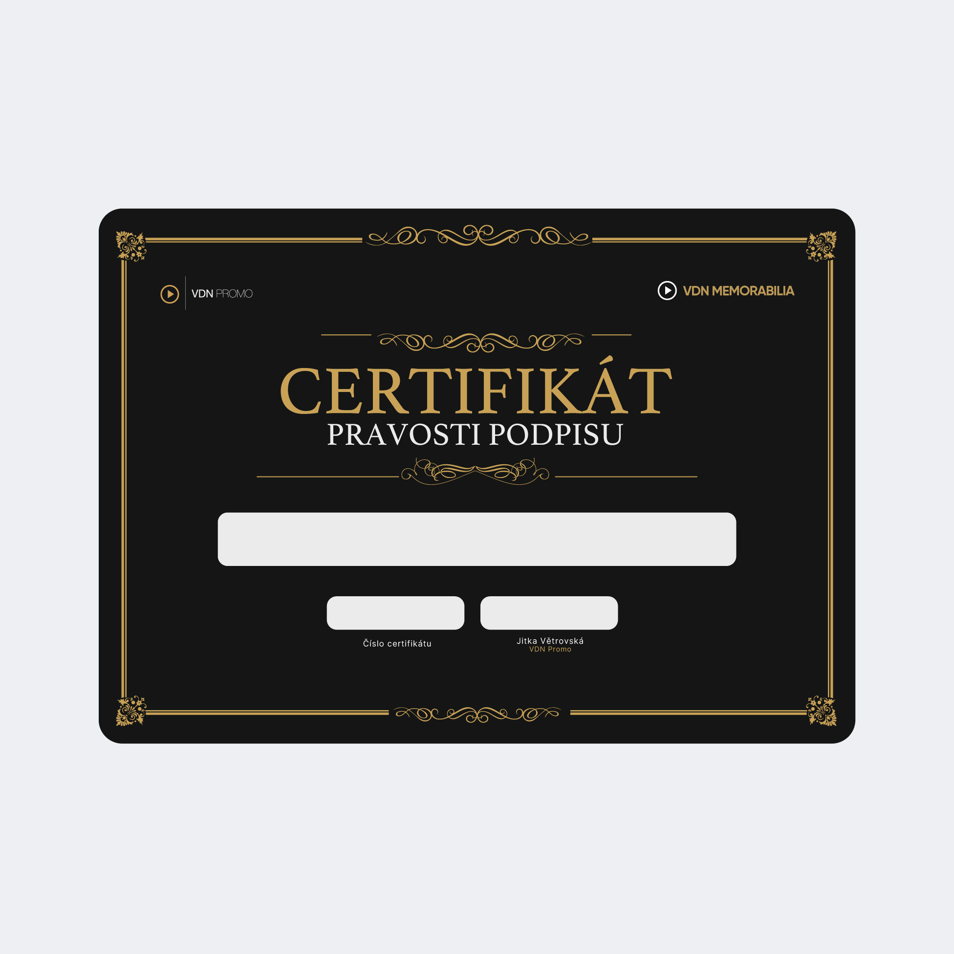 K předmětu u nás na eshopu, který obsahuji podpis, si můžete dokoupit certifikát pravosti podpisu (není-li automaticky přiložen).